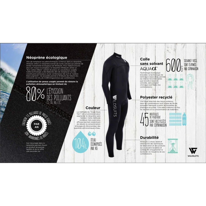 Wildsuits s’inspire des meilleurs spécificités présentent sur le marché qui ont été testées et approuvées par les consommateurs du monde entier (front zip, coutures GBS, full inside ruban de doublure, patch de renforcement, logos en silicone, poche discrète pour les clefs, 3D ink protection…).