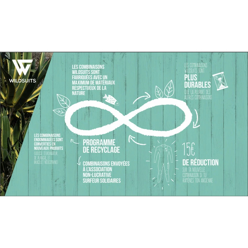 – Polyester recyclée: Une grande partie des tissus utilisés dans la combinaisons sont issues du recyclage de bouteille en plastique.