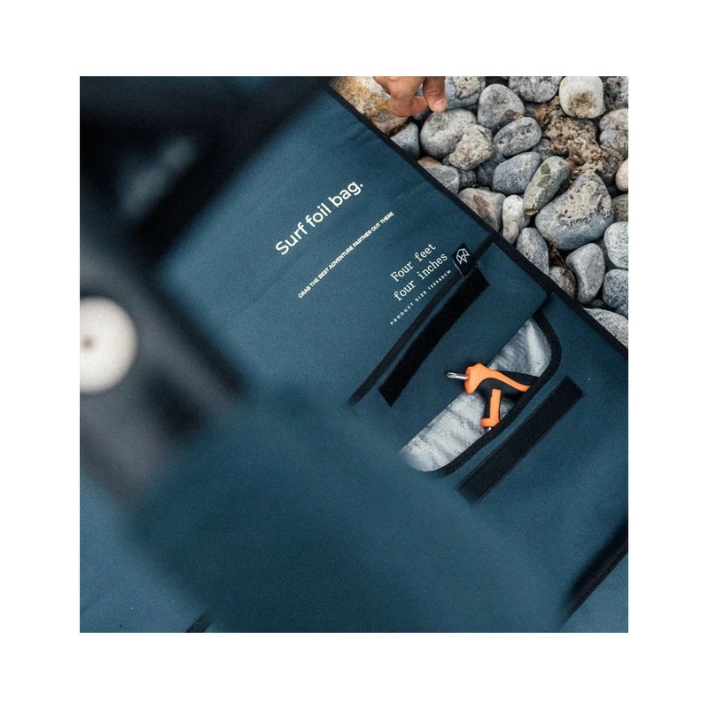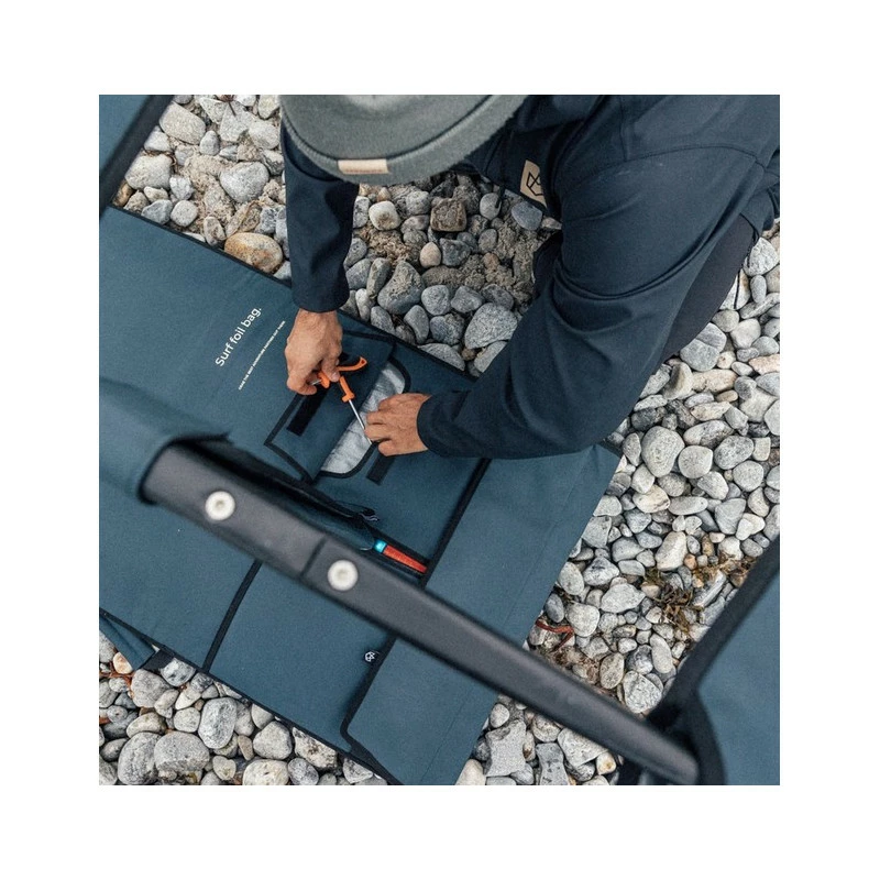 Elle est très pratique avec ses ouvertures en velcro qui permettent de ranger sa planche avec le foil montĂ© ou de le monter sur le sol sans risque d’abimer la planche.