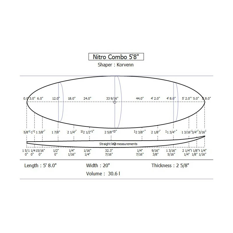 Le surf Nitro Combo est une planche très compacte, avec un rocker modéré, et une largeur assez importante. Le shape vise à optimiser la maniabilité, et à obtenir une planche capable de réaliser les courbes les plus serrées.