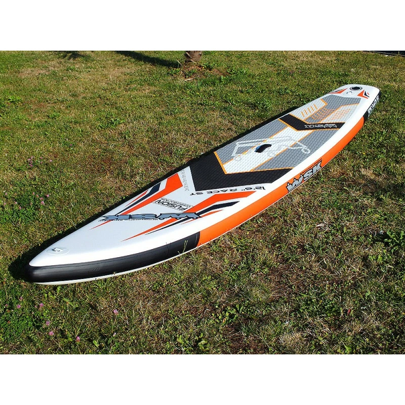 Le stand up paddle gonflable WSK 12’6″ Race est doté d’une fabrication haut de gamme en double peau, c’est à dire que l’enveloppe en PVC est constituée de 2 couches, afin d’optimiser la résistance à l’abrasion et aux UV, mais aussi d’assurer une excellente rigidité. WSK, premier fabricant de SUPs gonflables français (depuis 2007) a acquis la plus grande expérience en terme de développement dans le domaine, et utilise les technologies de pointe pour la construction de ses produits. les paddles sont assemblés à partir d’une modélisation 3d, et d’une machine à découpe numérique de haute précision. Ainsi les planches sont certifiées contre les vrilles, et les fuites. La structure interne constituée de fibres qui relient le pont et la carène (Drop stitch), présentent une forte densité, et un tressage spécifique, afin de conférer les meilleures performances, grâce à une rigidité accrue, et une fiabilité à toute épreuve. WSK garantie tous ses produits 2 ans.